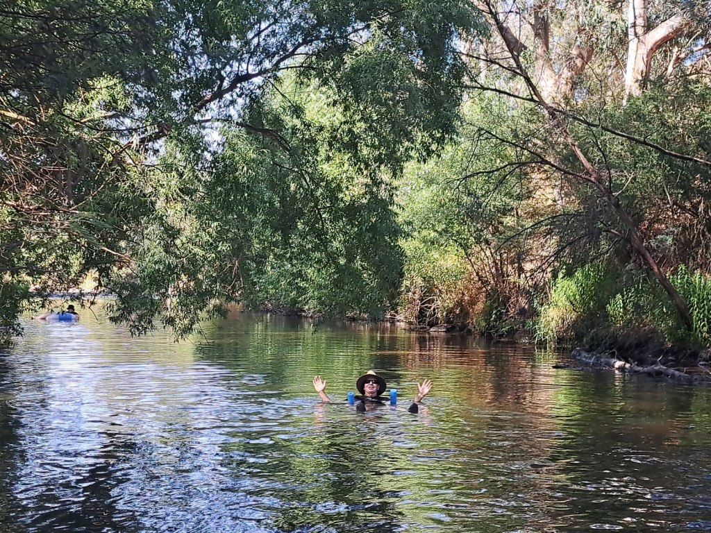 it was too hot to do much walking, so we opted to return to camp.and spend the heat of the day in the creek with many other festival goers.